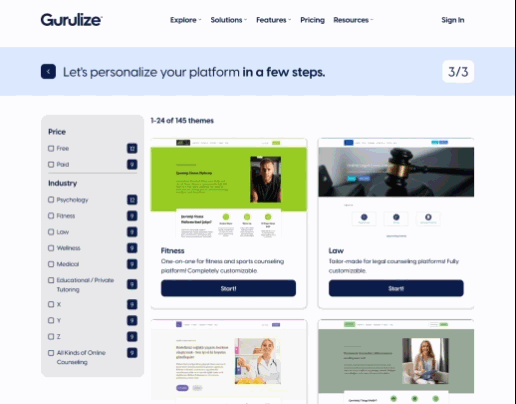Gurulize puts the creative control in your hands. Choose your domain, theme, CMS, design tools, and blog features to shape your unique platform.